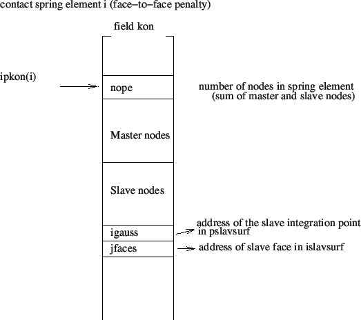 For face-to-face penalty contact contact.c only calls routine gencontelem_f2f. At the start of a new increment the field pmastsurf is filled for those slave integration points for which an opposite master face is found. It contains the local coordinates of the master face, its label (10*element+local face number) and the local normals. Furthermore, field springarea is filled containing the corresponding slave area and the overlap at the start of each increment in the first step. Please note that pmastsurf and springarea are calculated at the start of an increment and kept constant for all iterations across the complete increment. The contact spring elements, however, are generated anew in each iteration based on the sign of the clearance. A contact element is generated only if the clearance is negative (i.e. in case of penetration). The topology of the spring element is stored in field kon (Figure 170) and contains the total number of nodes (slave+master), the master nodes, the slave nodes, the address of the integration point in pslavsurf and the address of the slave face in islavsurf.